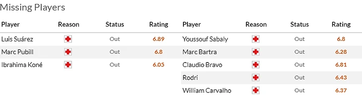 На что обратить внимание: На Лигу Европы. Севилье еще предстоит побороться за то чтобы опять забрать себе этот трофей, а вот Вильярреал уже тама. Более того на следующей неделе Субмарине предстоит сыграть перенесенный матч с Маккаби, так что ждите в составе внезапных ротаций. Марселиньо это любит. Правда выбор юнитов у тренера несколько ограничен: до сих пор недоступен Серлот(7,5) не очень понятно, готовы ли играть Суарес(6,5) с Ахомашем(6).