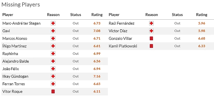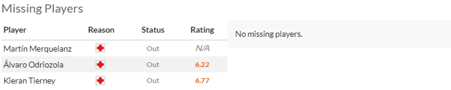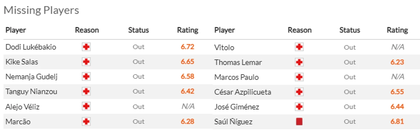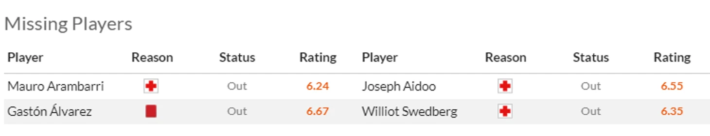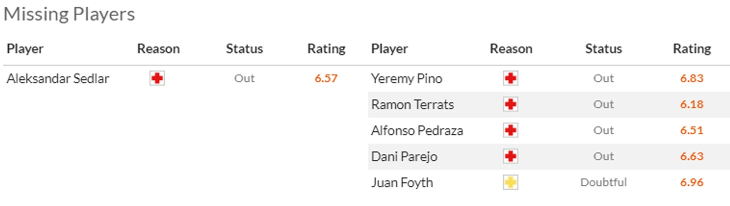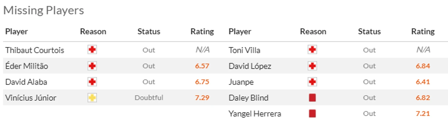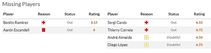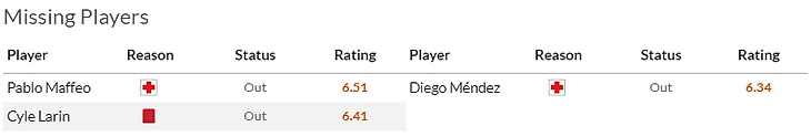 Дополнительная головная боль от Кубка - это конечно травмы. Из-за такого повреждения хозяева не смогут рассчитывать на Беккера(7) и очень надеются, что повреждения Элустондо(6) и особенно Ойарсабаля(8) окажется не очень серьезным. Ну и да, Айен Муньос(5,5) и Карлос Фернандес(6,5) надолго застряли в лазарете.