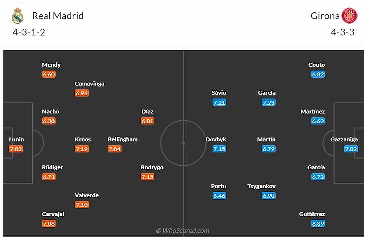 На что обратить внимание: На Винисиуса(10). В прошлом туре вингер получил повреждение по время предыгровой разминки и пропустил мадридское дерби, так что главный вопрос теперь - насколько серьезной оказалась болячка бразильца. Судя по тому, что сегодня Винисиус (как и Антонио Рюдигер(6,5) тренировался в общей группе, его выход на поле против Жироны вполне вероятен. Тем более, что Карло Анчелотти лично подтвердил, что бразилец готов играть. А вот Начо(6,5) вероятнее всего встречу с каталонцами пропустит..