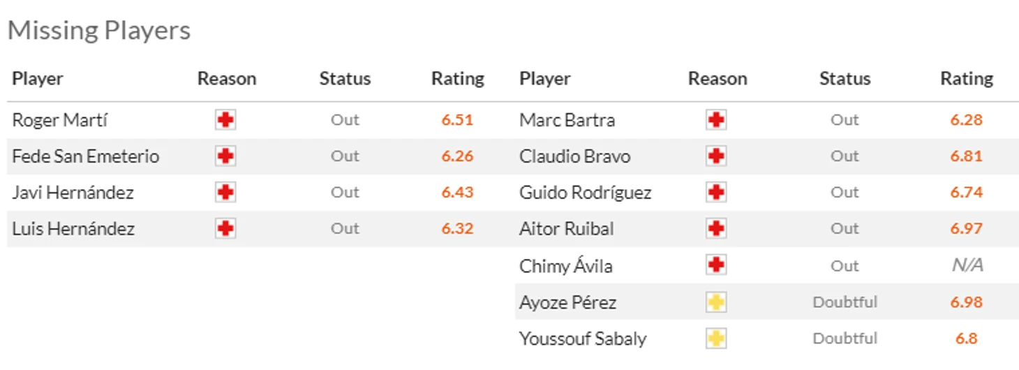 На что обратить внимание: На Иско(7,5). Лидер андалусийского клуб совершенно невовремя получил тяжелую травму и теперь пропустит примерно полтора месяца. Также не вошли в заявку гостей травмированные Абнер(5,5), Сабали(6), Айосе Перес(7,5) и застрявший в Африке Бакамбю(?).