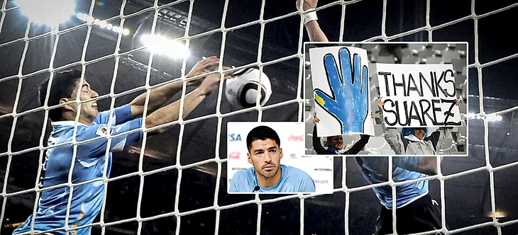 В 2010 году на Чемпионате Мира в четвертьфинале против сборной Ганы Суареса удалили с поля за то, что тот отбил мяч рукой из пустых ворот в самом конце дополнительного времени при равном счёте. В итоге Уругвай вышел в полуфинал после серии пенальти, а Луиса дисквалифицировали. Этот момент ещё долго обсуждали в газетах, но сам Суарес не считает, что сделал что-то ужасное. Он просто предотвратил гол и заплатил за это сполна.