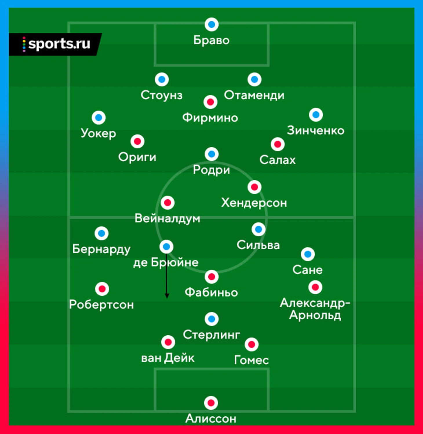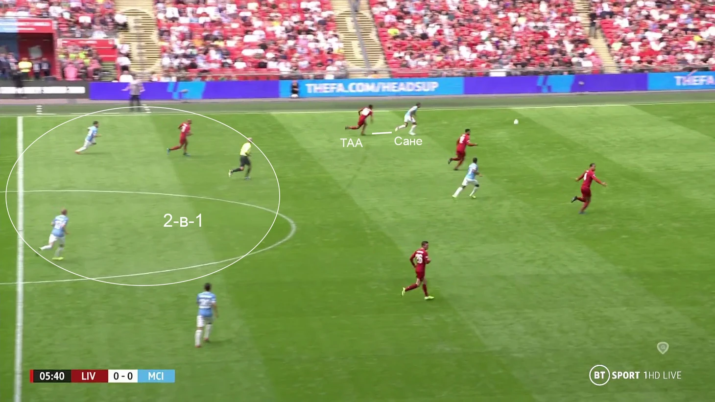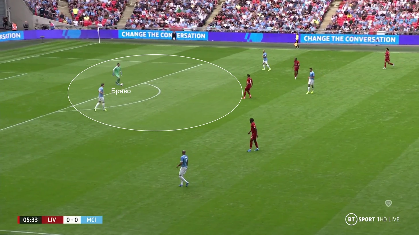 Прием выглядел продуманным – Клаудио всегда метил в зону Трента Александра-Арнолда, где сначала открывался Сане, а после его травмы Стерлинг или Жезус. «Наибольшей угрозой были дальние передачи от Браво. Он забрасывал за спину нашей линии защиты, которая в этом матче не всегда была линией. Таким образом «Сити» пытался растянуть нашу схему», – объяснял Клопп.