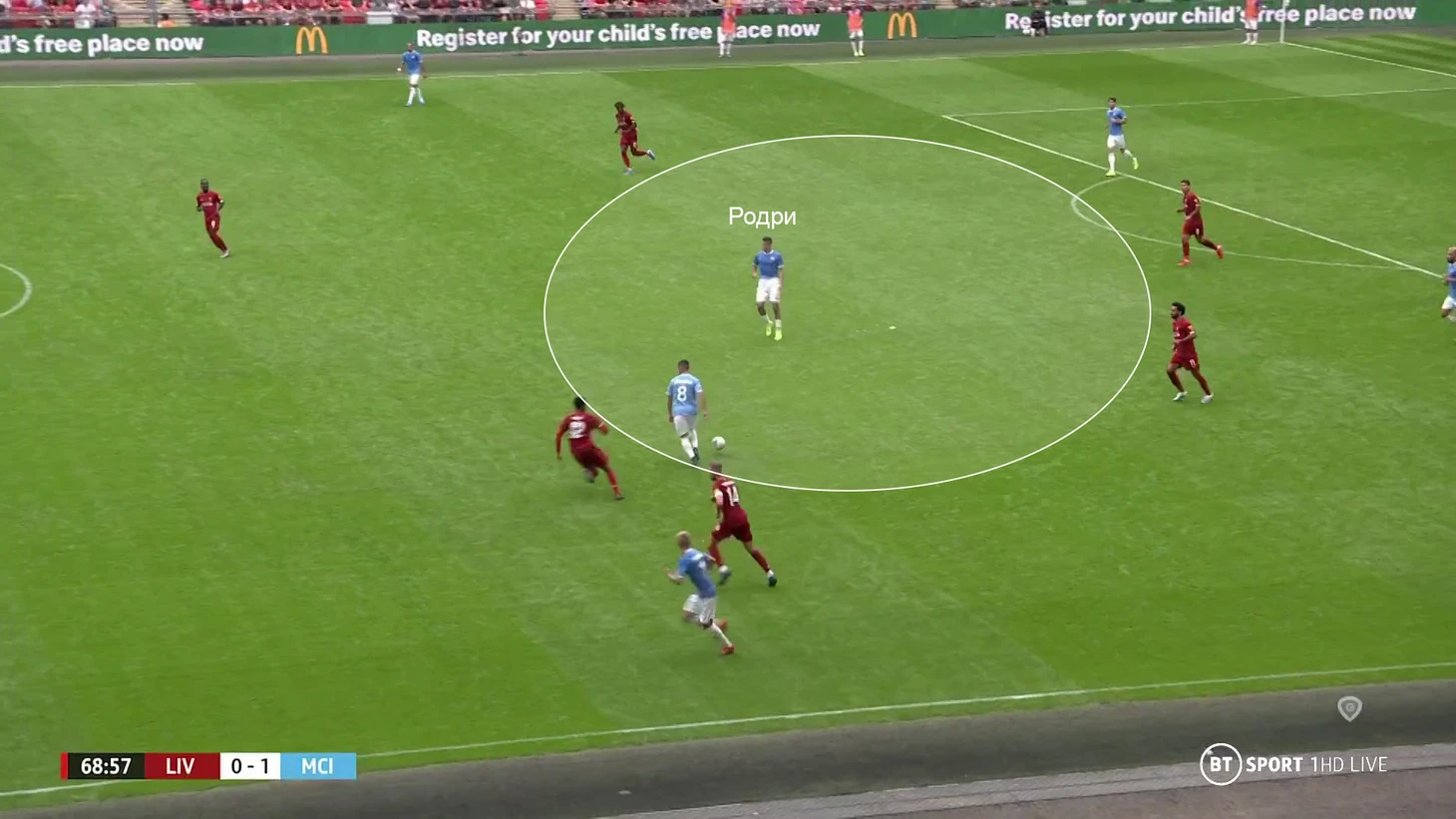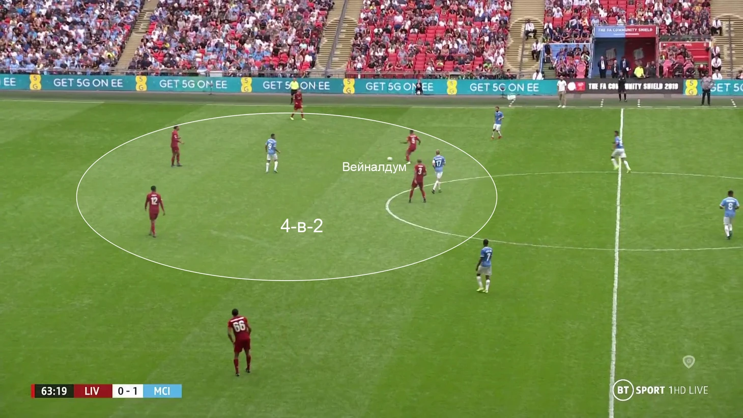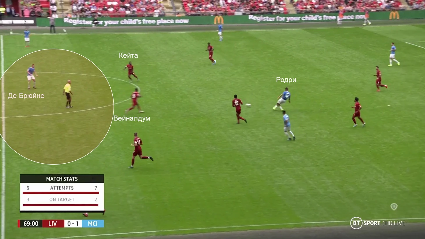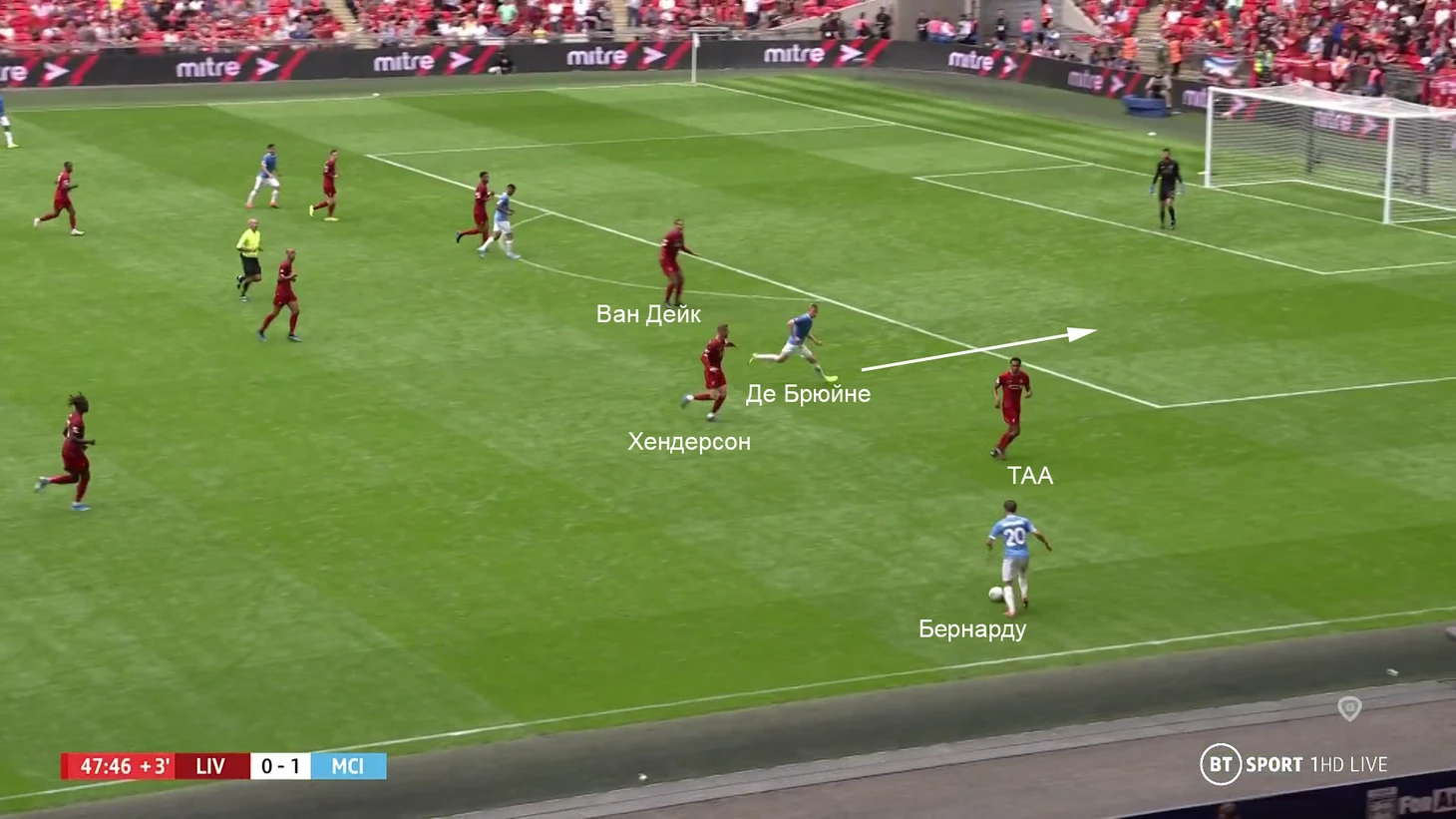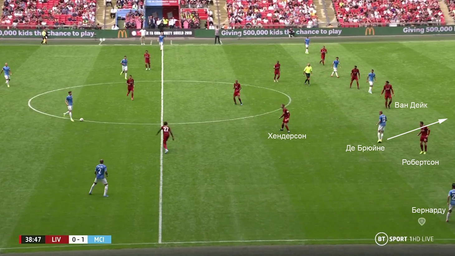 Формальный оппонент КДБ, Хендерсон, не может опускаться за ним так глубоко – разрушится структура полузащиты. Робертсон разрывается между КДБ и Бернарду. Если побежит за Кевином, то Бернарду получит пространство для любимого смещения в центр под левую. Ван Дейк в теории мог лучше разбираться в таких эпизодах и принимать на себя Де Брюйне, но слишком поздно реагировал, когда уже нужно было исправлять ситуацию:
