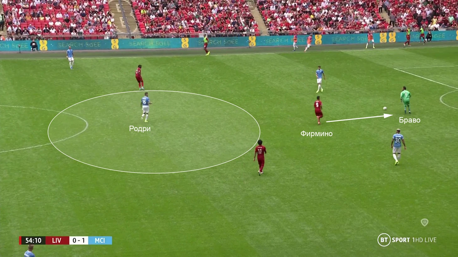 К сожалению, в трансляции не показывали этот розыгрыш с оптимальной камеры (мы не могли видеть положение защиты «Ливерпуля», когда мяч у Браво), но общая идея выглядела так. «Ливерпуль» в выжидательной позиции, Браво свободен и получает время на поиск паса: