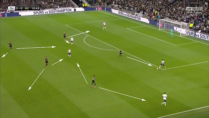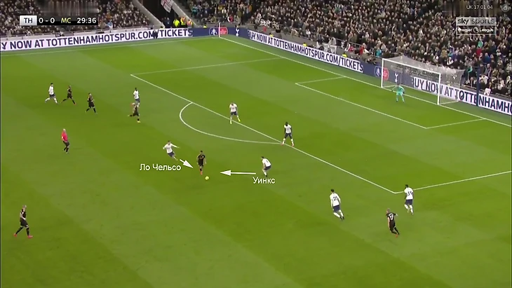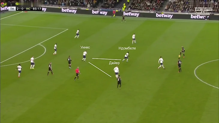 Работало примерно так – более свежие Ндомбеле и Дайер прессингуют футболиста «Сити» с мячом, а Уинкс располагается глубже и держит зону: