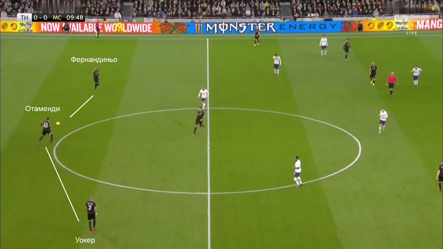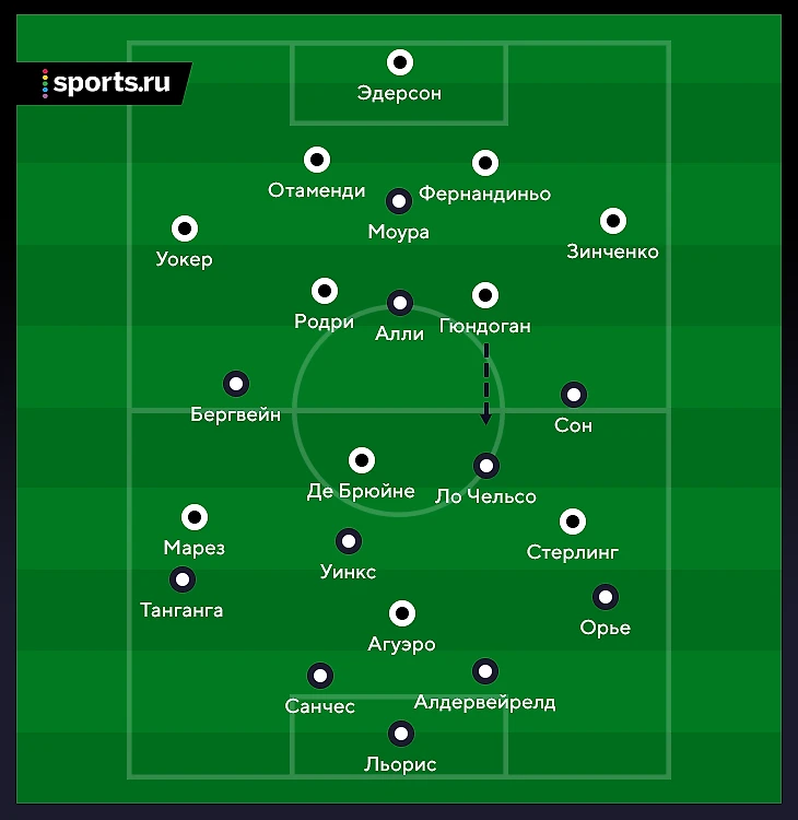 11. Описанная картина сохранялась, пока команды играли в равных составах. После удаления Зинченко и мгновенного гола хозяев «Сити» перестроился на 4-4-1-0. Агуэро ушел, Де Брюйне играл повыше остальных. При позиционных атаках позицию нападающего эпизодически закрывал Стерлинг.