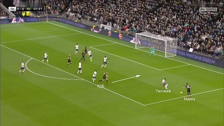 Танганга был так хорош, что «Сити» по ходу тайма поменял стратегию на этом фланге: КДБ становился фланговым полузащитником, а Марез уходил в центр раньше. Это приводило к навесам (у КДБ они опасные, но не вчера – в любом случае с ними проще справиться, чем с проникновениями в штрафную).