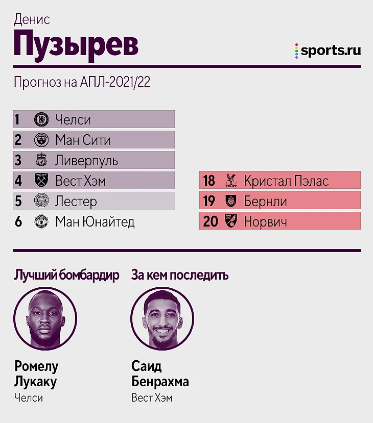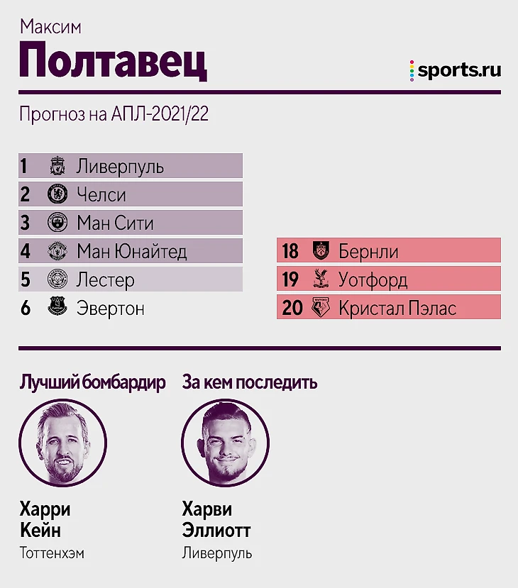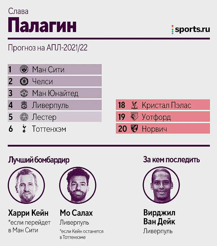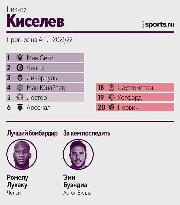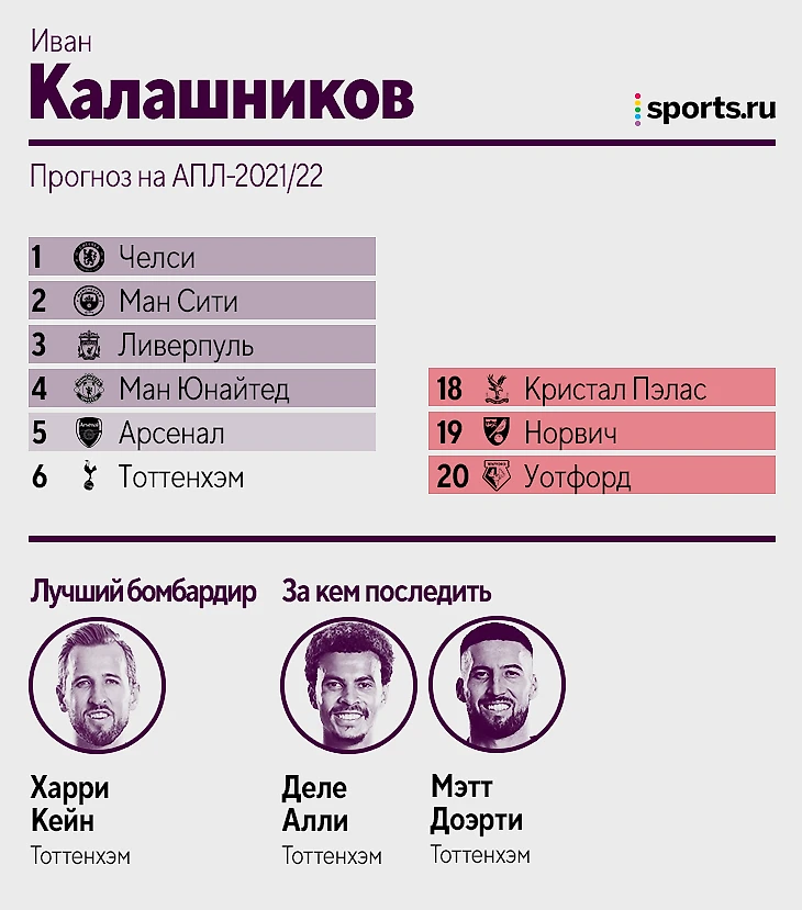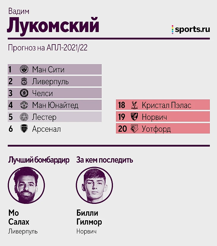 Я всегда топлю за андердогов, но в этом сезоне места в топ-6 наконец-то займут команды из топ-6 – мир возвращается к нормальности, и футбол вместе с ним. За титул поспорят «Челси» и «Сити» – две команды с великолепным выбором атакующих игроков, и сильнее окажется та, в которой тренер не сходит с ума от перспективы попробовать каждого из них на новой позиции. «Ливерпуль» попадет в Лигу чемпионов, но отпустит в конце сезона либо Салаха, либо Мане, а единственной победой «Арсенала» станет финиш выше «Тоттенхэма» – пора уже возвращать эти славные времена.