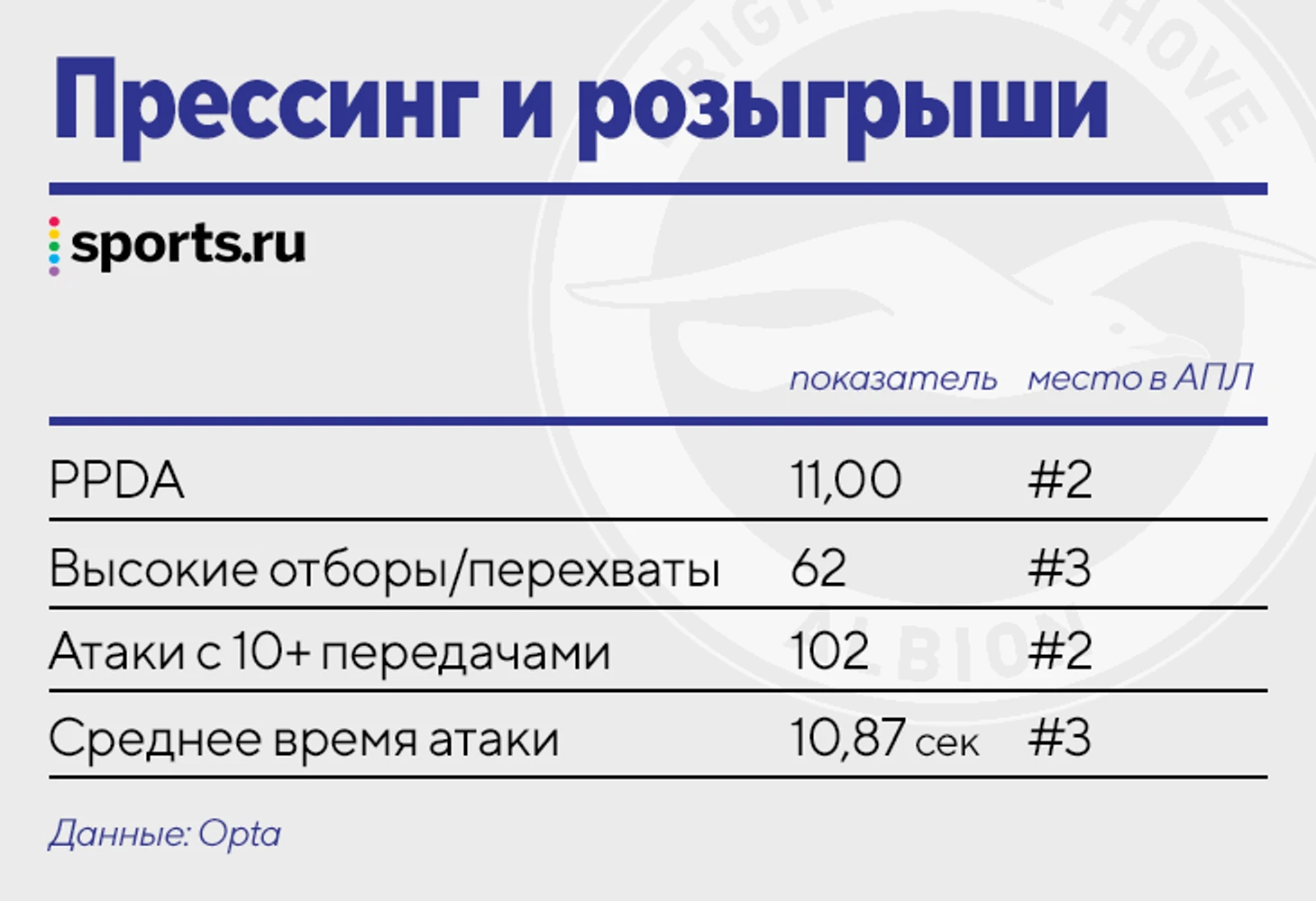 К счастью для Поттера, уникальность стиля не вызывает сомнений, даже если ориентироваться только на факты. В плане смелости в прессинге и при розыгрышах мяча «Брайтон» конкурирует с лучшими клубами АПЛ: