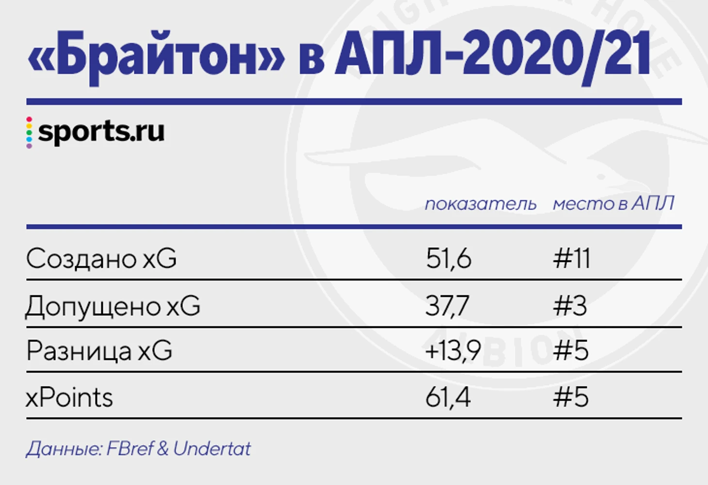 В прошлом сезоне «Брайтон» финишировал 16-м, но собрал впечатляющую коллекцию «ожидаемых» достижений: