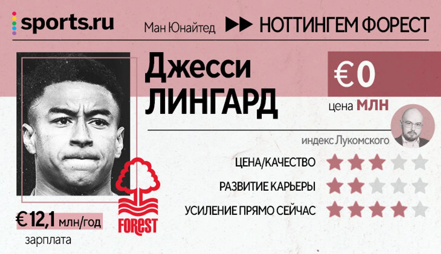 Одна из самых интересных сделок лета. За сезон в «Форест» Лингард заработает в 2,5 раза больше, чем получал в «МЮ» (!!!) – при этом контракт лишь на год. Джесси мог выбрать возвращение в «Вест Хэм» с долгосрочным контрактом на близких к прежним условиях, но предпочел краткосрочный выгодный контракт.