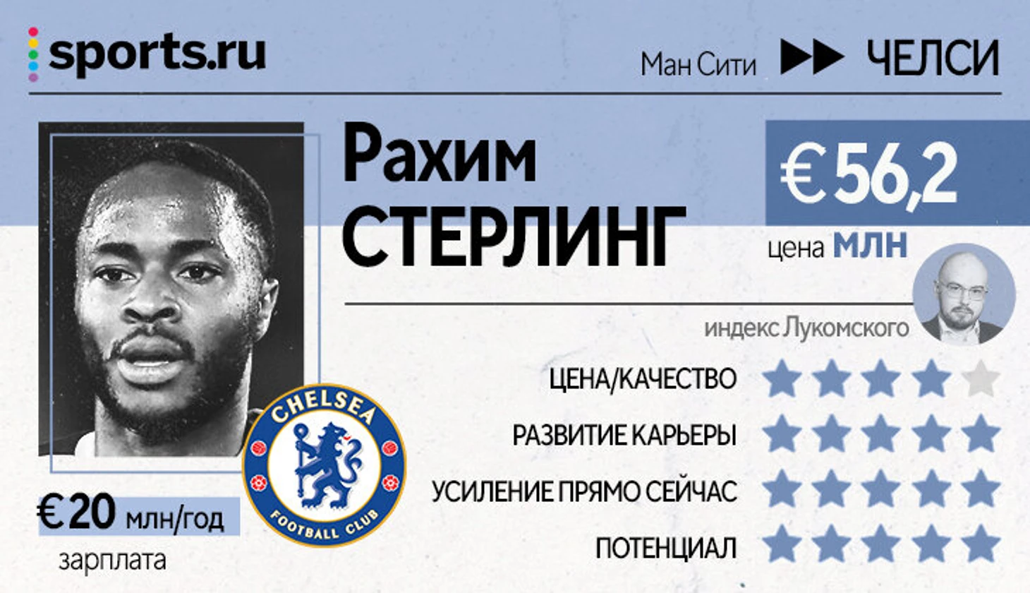 Ключевой статус Стерлинга в новой команде никто не оспаривает. Рахим не скрывал важность этого фактора перед ЧМ, а «Челси» умело использовал это в свою пользу. Логика у трансфера очень стройная, но соотношение цена/качество слегка напрягает. Стерлингу дали самую высокую в клубе зарплату – большой аванс, учитывая его предыдущий статус (категорически полезный, но все-таки игрок ротации в «Сити»).