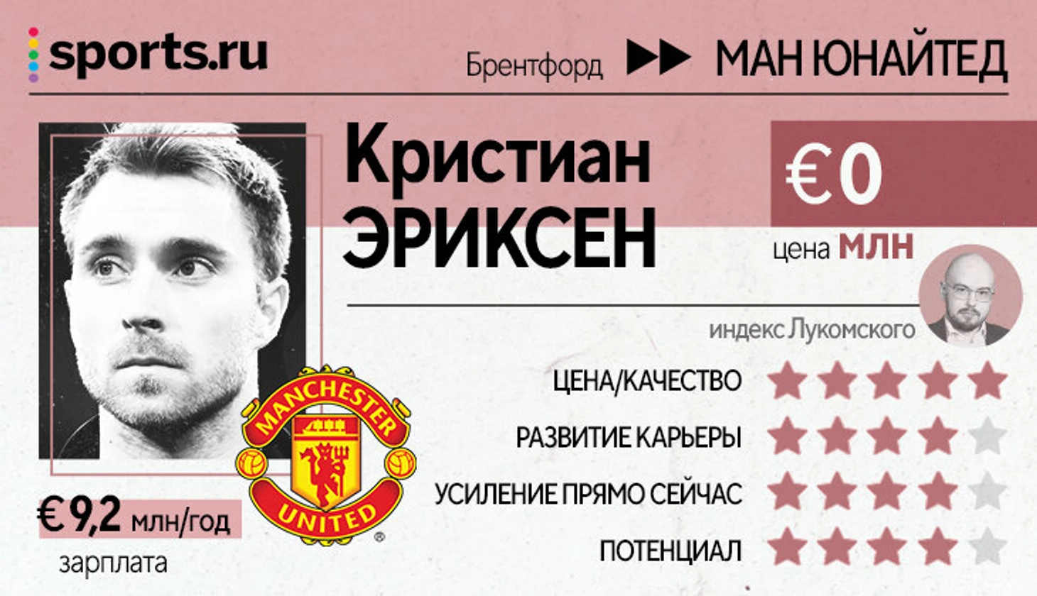 Датчанин провел волшебные полсезона в «Брентфорде» – и заслужил возвращение в топ-клуб. Плюс его перехода в «Юнайтед» – он отлично подходит под футбол Тен Хага. Минус – ему нет четкой позиции в этой системе. Но это компенсируется тем, что Эриксен может приносить пользу в разных ролях.