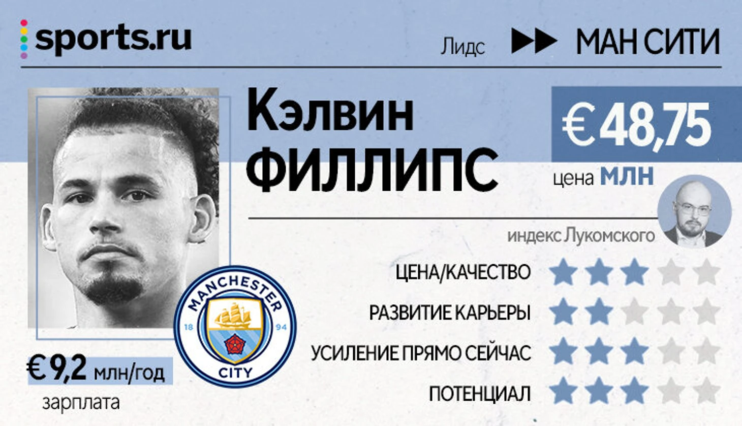 «Сити» забрал основного опорника «Лидса» и важного полузащитника сборной Англии в год ЧМ после лучшего сезона в карьере Родри, который играет почти без травм. Выглядит не очень логично для всех сторон. «Сити» явно переплачивает за плюс-минус 10 матчей в старте (даже если они будут успешными), а Филлипс с огромной вероятностью лишается регулярной практики перед большим турниром сборных.