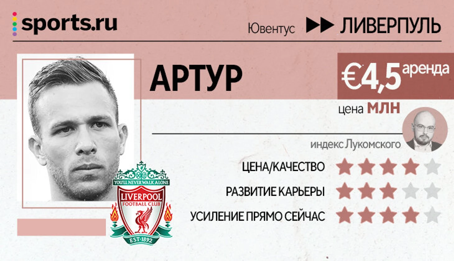 Неоднозначная, но потенциально мощная сделка. На эпидемию травм в полузащите «Ливерпуль» отреагировал арендой травматичного полузащитника, но это может сработать. В последние недели сильнее всего команде не хватает качеств Тиаго Алькантары (кстати, Артура еще в «Гремио» с ним сравнивали). Их нехватку Артур может с компенсировать, пускай с парой оговорок (не так хорош без мяча и хуже обостряет, но даст нужный ритм игры в пас).
