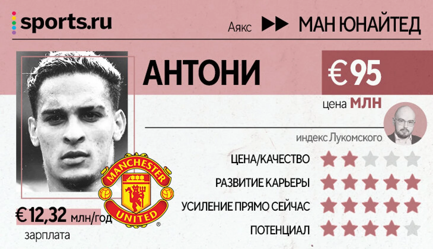 Хайлайт саги с переходом бразильца – слова тренера «Аякса» Алфреда Схройдера: «В наше время трансферные суммы – безумны. «Барселона» платит 115 млн за Дембеле, «МЮ» отдает больше 100 млн за Санчо. Если так, то можно заплатить столько и за Антони. Стоят ли игроки этих денег? Нет. Но их заплатят».