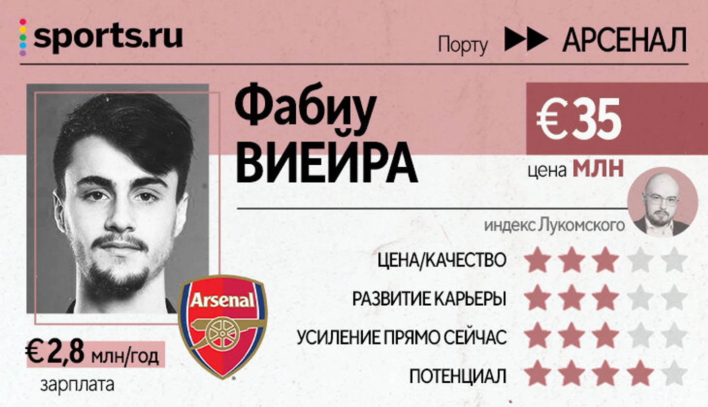 Немного настораживает отсутствие хотя бы одного полного сезона во взрослом футболе – при весьма высокой трансферной стоимости. Если сложить все минуты Виейры за три сезона в «Порту», то получится всего 26,2 90-минутки. То есть даже за три года у него не набирается один полноценный сезон в старте (зато ценник больше 1 млн за каждую 90-минутку). Даже в последний год он был игроком ротации. В общем, пока сырой (и хотя бы без высокой з/п), но как усиление глубины состава подходит.
