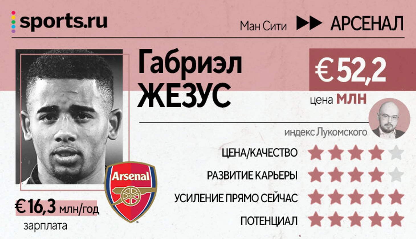 «Арсенал» разменял Алекса Ляказетта (нападающего с кучей скрытых достоинств, но без голов) на Габи Жезуса – нападающего, который дает все те же скрытые достоинства (даже больше – например, он вариативнее открывается), но еще и забивает. Очевидный апгрейд позиции без какого-либо ущерба системе.