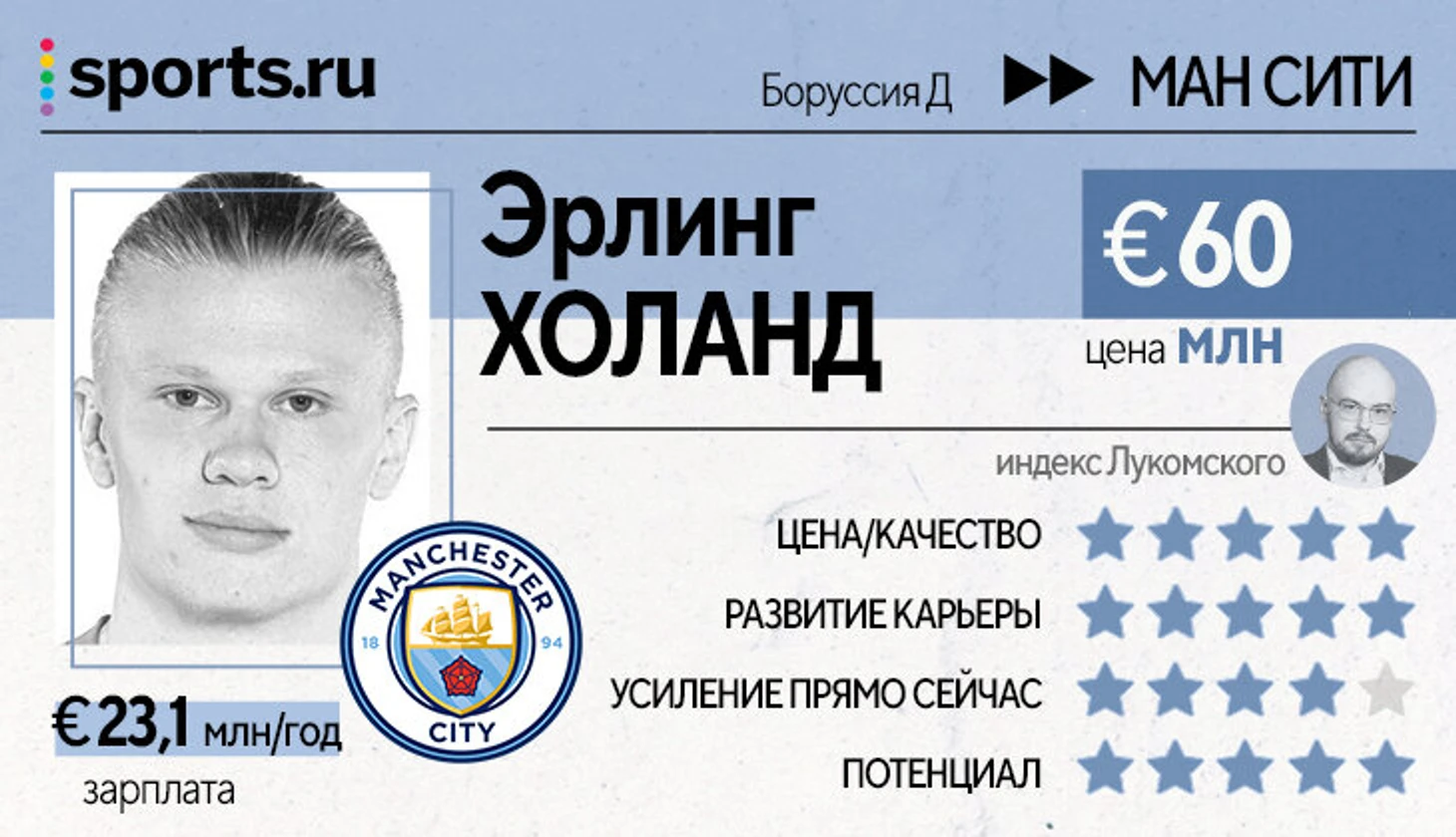 Из-за желания норвежца сменить клуб именно этим летом, подкрепленного пунктом о скромных для его статуса отступных, «Ман Сити» взял Эрлинга существенно ниже рыночной цены. Объективно Холанд за 60 млн – просто подарок. Разумеется, в комплекте идет большая зарплата – самая высокая среди всех игроков, которые сменили команду этим летом. Но прямо завышенной она не кажется – примерно столько должен получать один из главных игроков нового поколения после перехода в самый богатый клуб самой богатой лиги мира.