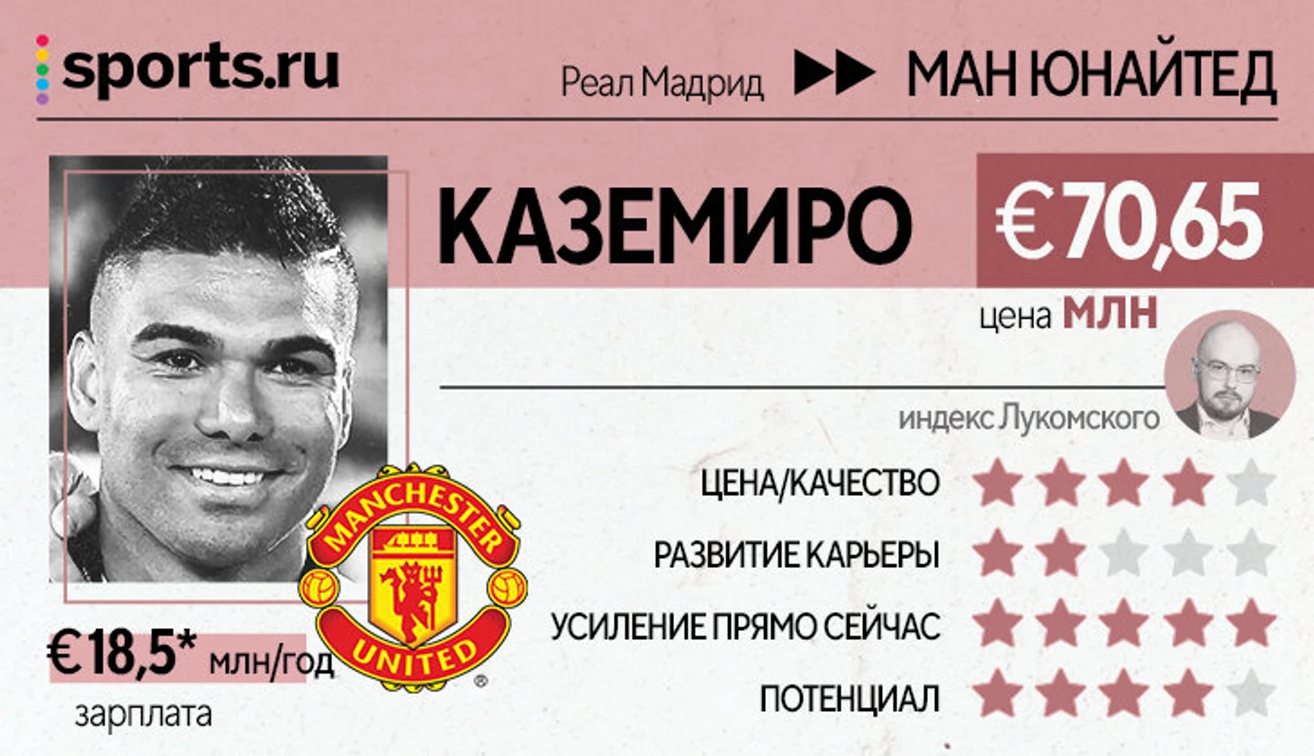 С точки зрения задействованных ресурсов трансфер 30-летнего Каземиро кажется жестом отчаяния. «МЮ» был в поисках все лето, рассматривал на эту позицию игроков другого типажа и уровня, а потом просто решил дать «Реалу» и самому бразильцу сколько они пожелают, чтобы прекратить трансферные метания. Каземиро слишком хорош и может оправдать даже такой аванс, но, учитывая возраст, позицию и срок контракта, траты правда огромные.