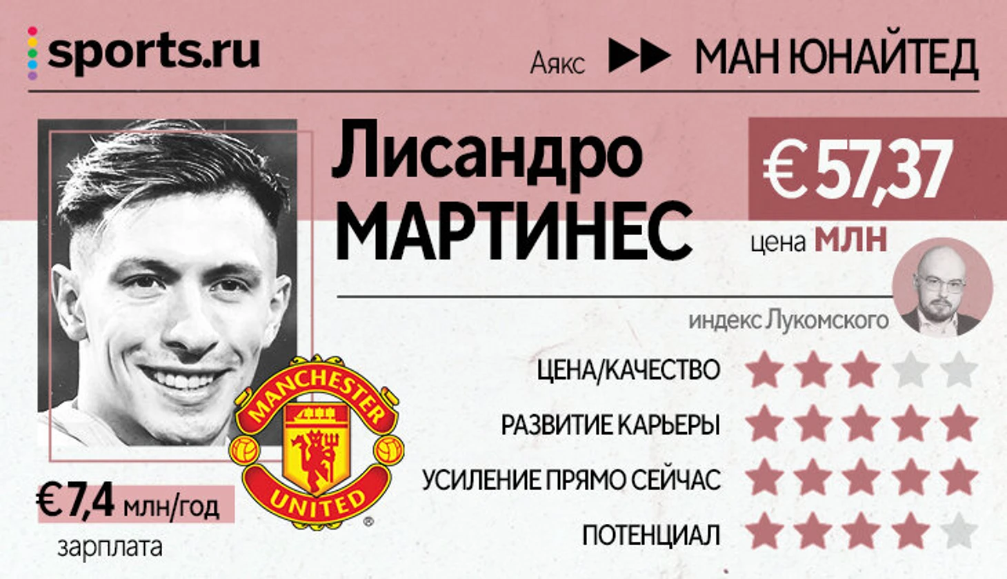«Аякс» мастерски использовал близкое знакомство Тен Хага с возможностями Мартинеса – клуб продал его в 8 раз дороже, чем купил всего два года назад. В случае успешной интеграции футбола ЭТХ трансфер может оправдаться, но как быть в альтернативных сценариях? Лисандро точно не выглядит защитником на такую сумму в любой системе. Топовый, но узкопрофильный исполнитель.