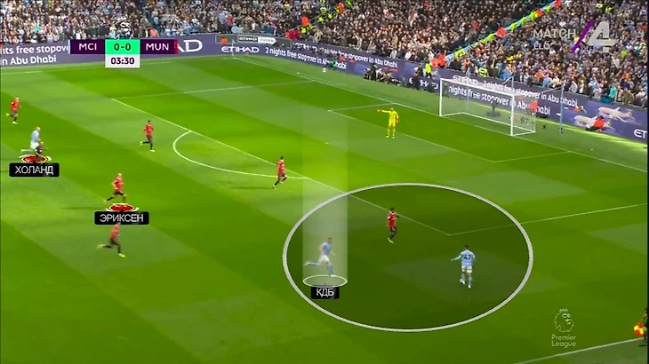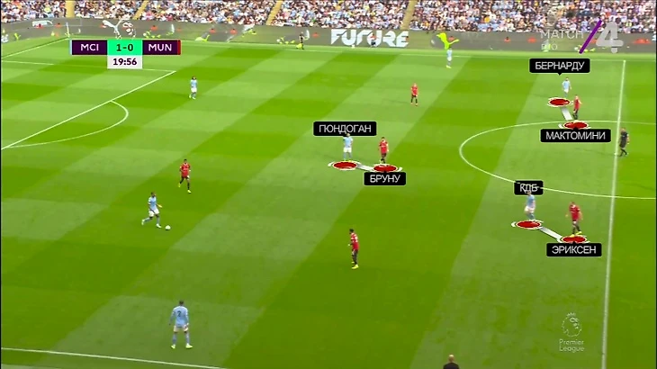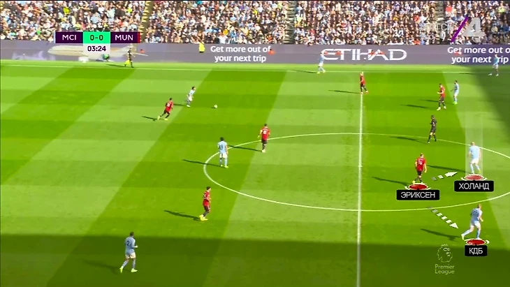 На «Этихаде» к этому добавилась почти персональная игра в полузащите. Помогало наложение схем: Бруну действовал четко по Гюндогану, Эриксен – по КДБ, Мактомини – по Бернарду:
