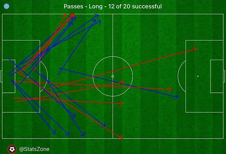 При четком следовании этим принципам у «Сити» из рабочих вариантов оставались бы только фланги. Это не всегда ужасно – «Арсенал» и «Реал Сосьедад» неплохо их использовали против «МЮ» и за счет этого продвигались в атаку. По карте длинных передач Эдерсона тоже очевиден акцент «Сити» на края: