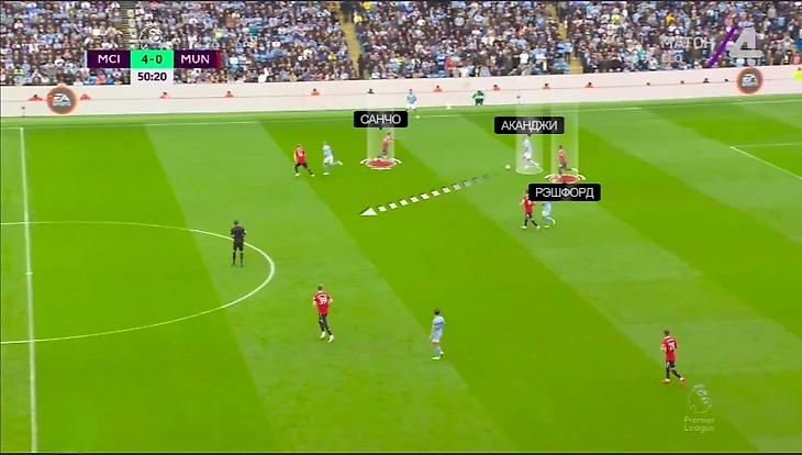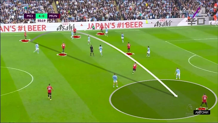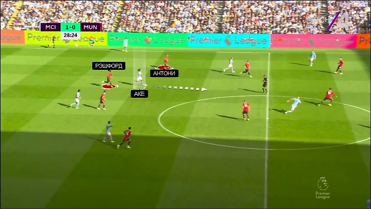 Первоочередной проблемой стала свобода центральных защитников – либо Аканджи, либо Аке. В идеальном рисунке одного берет Рэшфорд, другого – вингер с ближнего фланга (Санчо или Антони). Вчера было много пограничных эпизодов – вингеры занимали полупозицию, а Маркус не успевал накрыть обоих. Кто-то обязательно получал свободу и легко продвигался вперед: