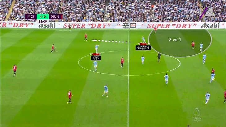 Заканчивается тем, что у «Сити» справа преимущество 2-в-1 – лишний тут как раз Де Брюйне: