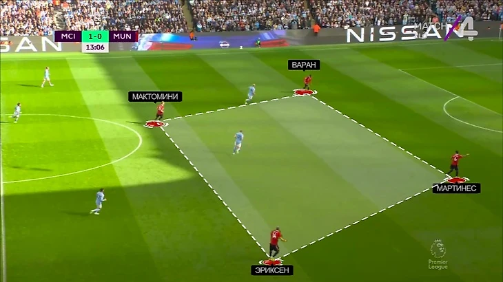 Пожалуй, наиболее симптоматичен тут эпизод перед первым голом. Эриксен и Мактомини решили не оставлять КДБ и Бернарду и опустились за ними прямо в штрафную. Итог – цепочка из шести защитников и пустота перед штрафной: