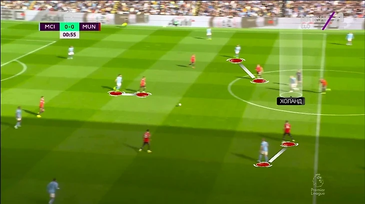 Один из них – опускания Холанда. В таких эпизодах норвежец действовал как классическая ложная девятка. То, что Эрлинг взял эту роль против «МЮ», показательно – опускаться за мячом он любит против команд, которые используют четверку защитников и позволяют атаковать через центр. Вчера было и то, и то: