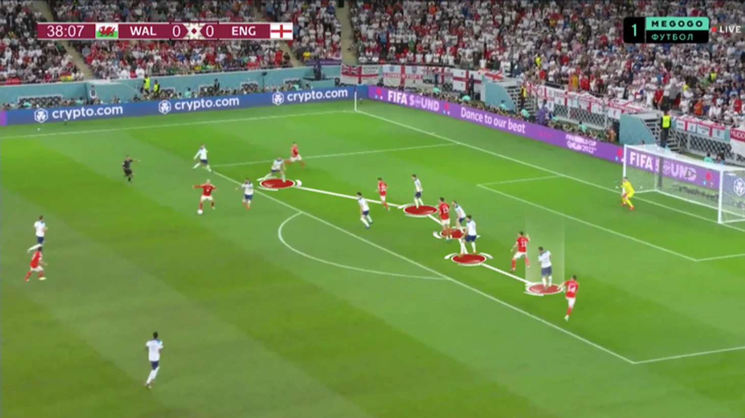 Готовность брать совсем неблагодарную работу фиксируют два момента. Тут – садится пятым защитником, когда оборону Англии внезапно растягивает Уэльс: