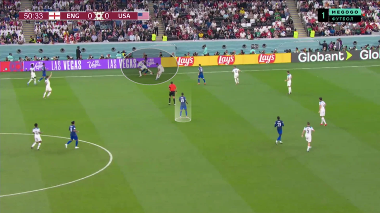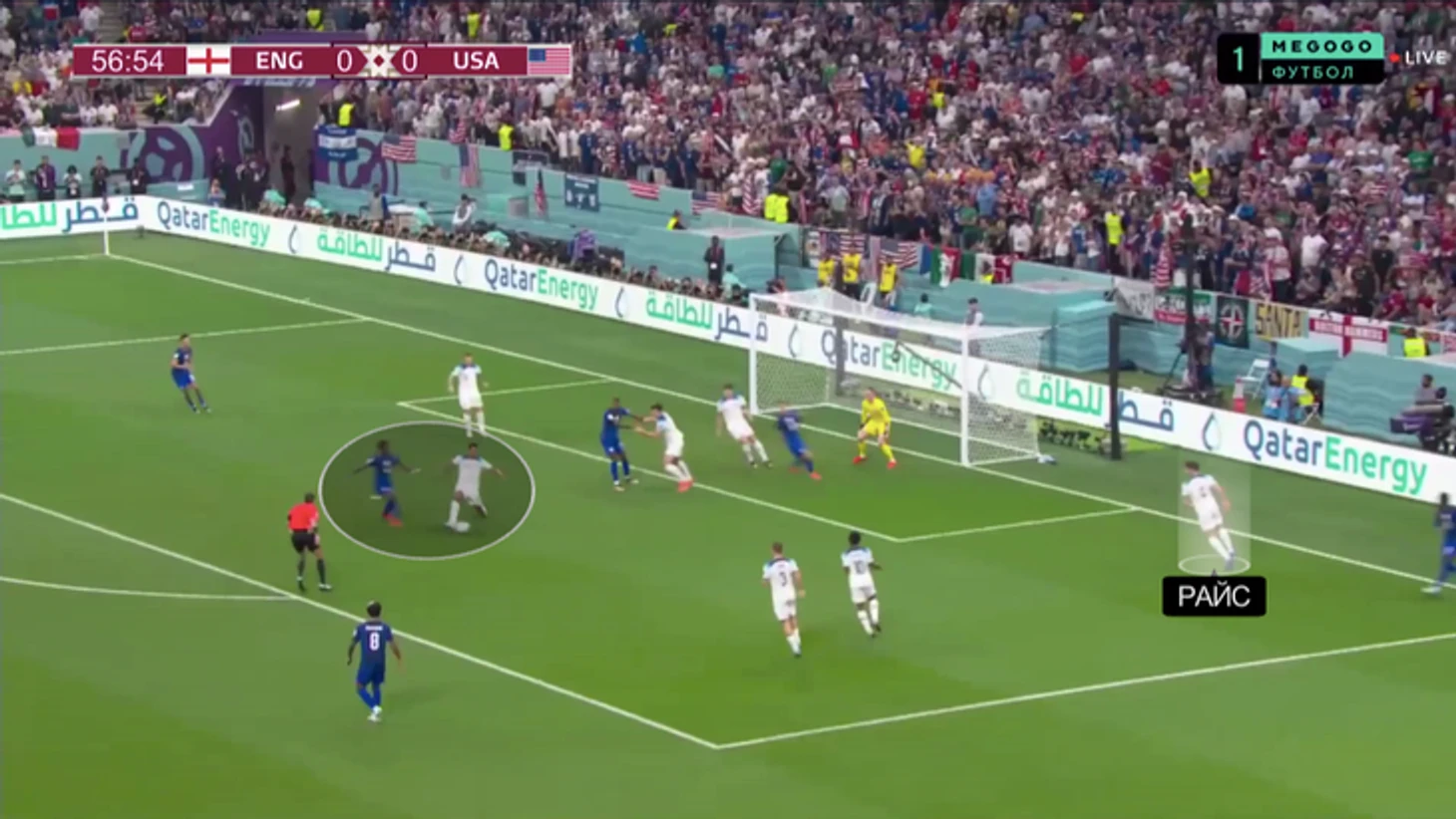 Похожий эпизод из матча с США. Сначала Беллингем оставляет соперника и сокращает пространство для рывка Кристиану Пулишичу: