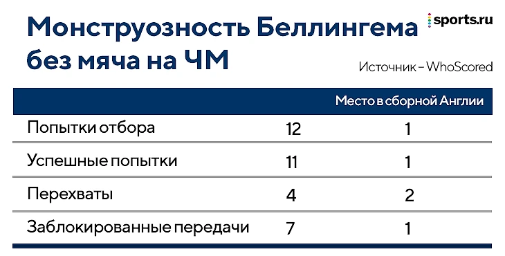 После матча с Сенегалом Саутгейт отмечал, что работа Беллингема и Хендерсона в прессинге принесла англичанам лучшие моменты с игры. Точно так же Джуд отрабатывает на других участках поля – у него место в топ-3 сборной по отборам на каждой трети поля (финальная, средняя и своя).