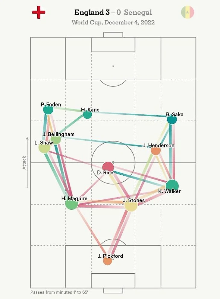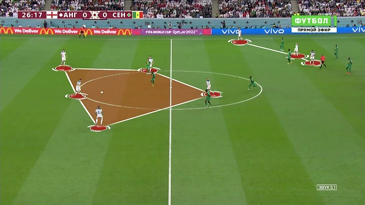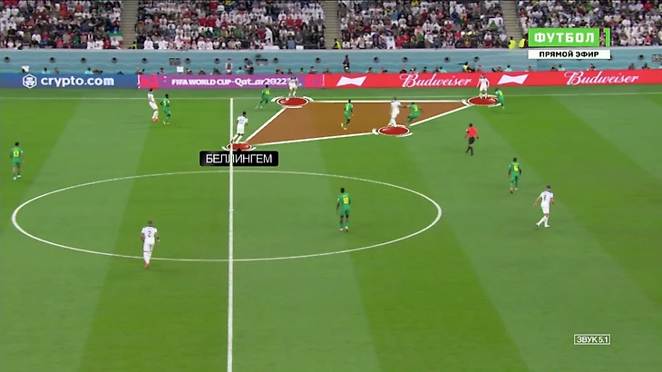 Что помогает Джуду? Внезапная заготовка Саутгейта – сырая по натренированности, но перспективная и учитывающая свободную манеру игроков. Неплохо прослеживается по карте передач Англии в матче с Сенегалом – у ближнего для Беллингема фланга создается перегруз, причем четвертым туда смещается Харри Кейн: