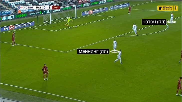 Медленное планомерное продвижение мяча защитниками и полузащитниками к финальной трети – преимущество «Суонси», которому находится противодействие. Например, достаточно искушенный в контексте Чемпионшипа «Норвич» применял цикличный высокий прессинг, который заставлял валлийцев совершать более поспешные действия. Более того, «канарейки» включились в это упражнение с первой же минуты, что привело к угловому на 11-й секунде и последующему голу. Спусковым крючком здесь стала передача назад.