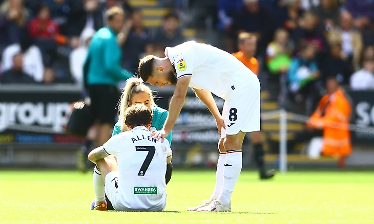 Нельзя не упомянуть самого известного игрока этого состава «лебедей» – Джо Аллена. Он, как и Фултон, обыкновенно играет рядом с Граймзом, балансируя между созданием численного перевеса в середине и подстраховкой защитников. Можно увидеть Аллена и внизу опорного треугольника. Джо хоть и держит планку по точности передач в районе 85%, но ключевой фигурой в команде Мартина пока не стал. Одна из причин – пропуск примерно половины матчей из-за проблем с коленом.