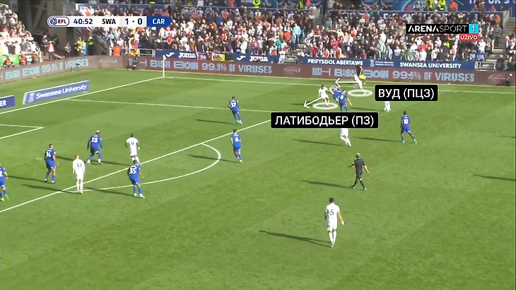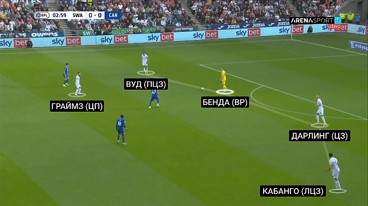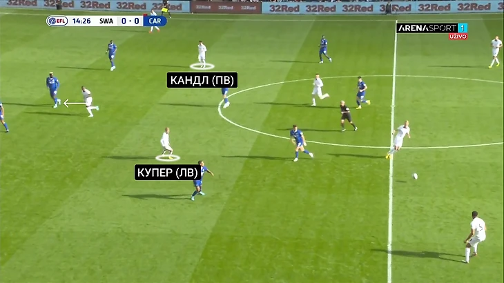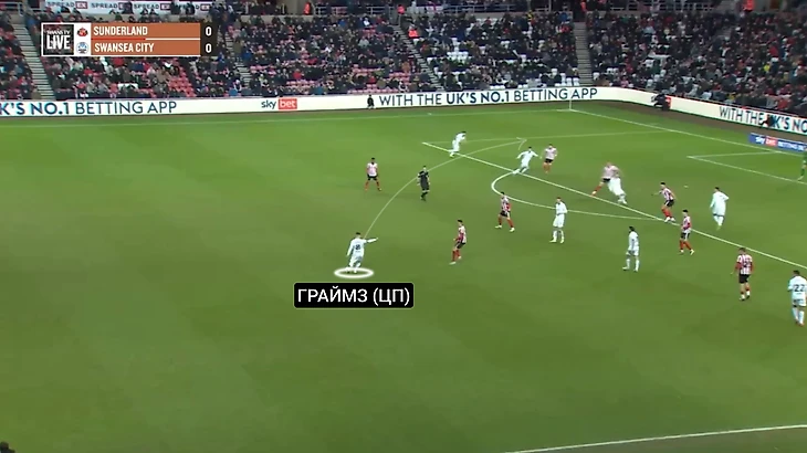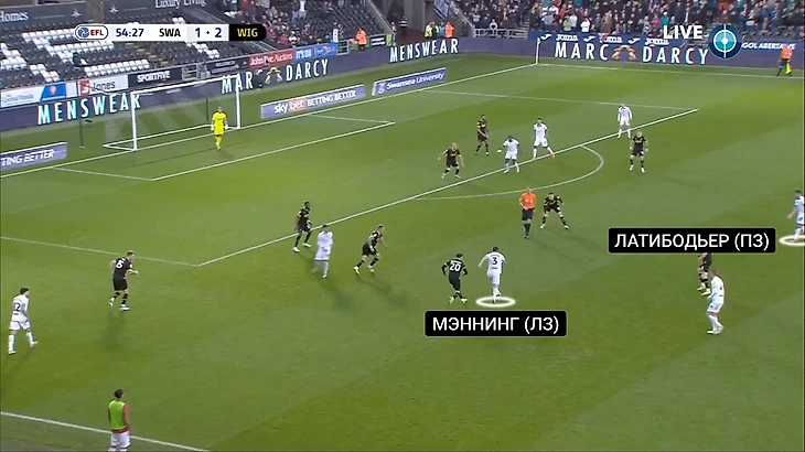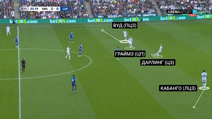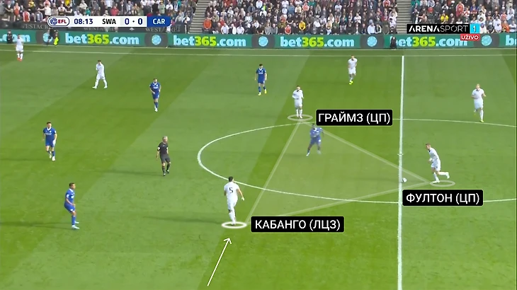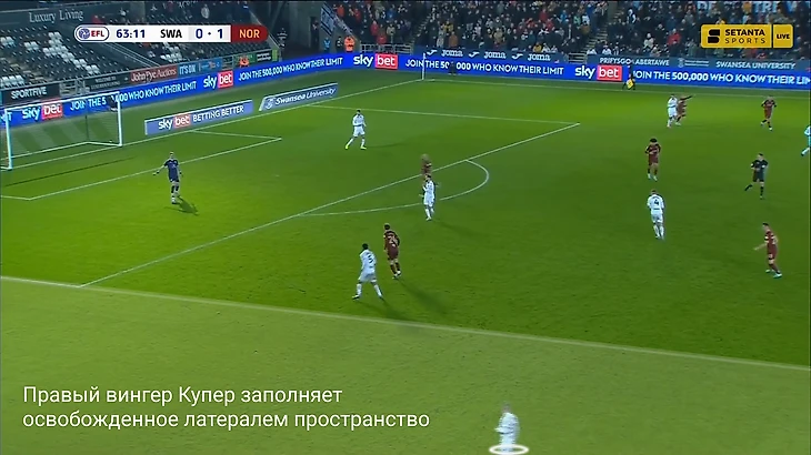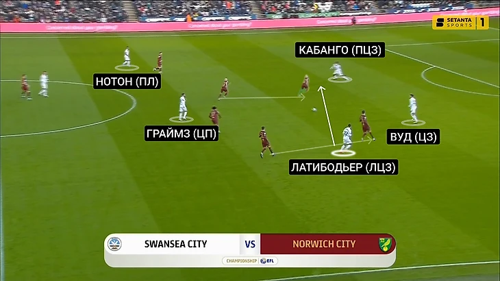 Более интересно использование крайнего центрального защитника тройки в качестве дополнительного опорного. Отличный пример из дерби против «Кардиффа», где Кабанго (второй в команде по прогрессивным передачам) сначала создал ширину, а затем откликнулся в центральном круге. Это дало больше свободы главному по прогрессивным передачам – Мэтту Граймзу. Теперь качественный исполнитель может найти передачу между линиями, либо сделать заброс за спину обороне в зоны врывающихся бровочников.