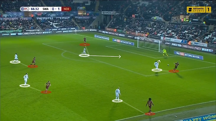 Еще одна сложность – предпоследняя и последняя передачи. Продвижение мяча по фазам завязано на Граймзе (топ-3 лиги среди полевых по Progressive Passing Distance), причем настолько, что англичанин – лидер Чемпионшипа по касаниям мяча. Мэтт прекрасен в точности пасов, умеет ускорять игру более рискованными продвижениями и вообще выглядит игроком уровня АПЛ, но соперники отлично осведомлены, через кого строится футбол Мартина. Следовательно, если Граймзу не дают необходимое пространство, то у «Суонси» начинаются проблемы с доставкой к штрафной. Здесь на выручку приходит Мэннинг, который отваливается для кроссов и более редких проникающих пасов, но разнообразия в этом немного.