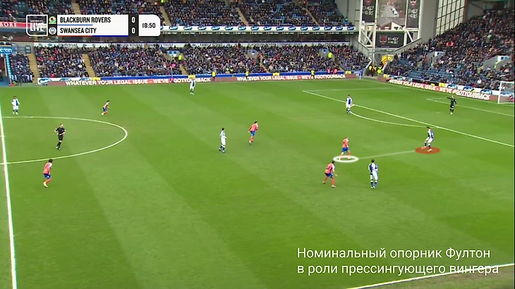 Роль шотландца сложно назвать однозначно зонной или персональной, поскольку в начале эпизода Фултон может действовать по левому центральному защитнику с мячом, но в ходе перевода ближе к другому флангу, переключиться на перекрытие опорника. Очевидно, что для таких блуждающих действий требуется высокий уровень атлетизма. Так или иначе, идея любопытная.