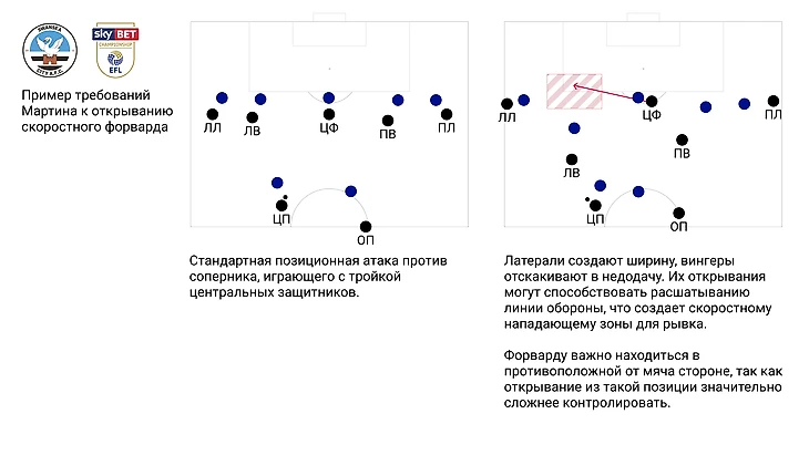 Ближе к атаке, будем называть их вингерами, чаще других можно увидеть Купера и Пиру (чуть реже – Нтчама и Кандла). Задача этих футболистов – найти пространство для приема мяча и его продвижения между своим форвардом и центральными полузащитниками. Фланговые позиции в этом случае уже заняты агрессивно поднятыми вингбеками. Соответственно, Мартин предполагает переход с 5-2-3 на 2-3-2-3, где в тройке полузащиты роль «лишнего» исполняет один из центральных защитников.