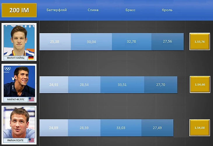 А теперь ещё одно сравнение, но уже с временем мирового рекорда Райана Лохте и победным олимпийским результатом Майкла Фелпса образца прошлого года, которые по разным причинам пропускают предстоящий чемпионат мира.