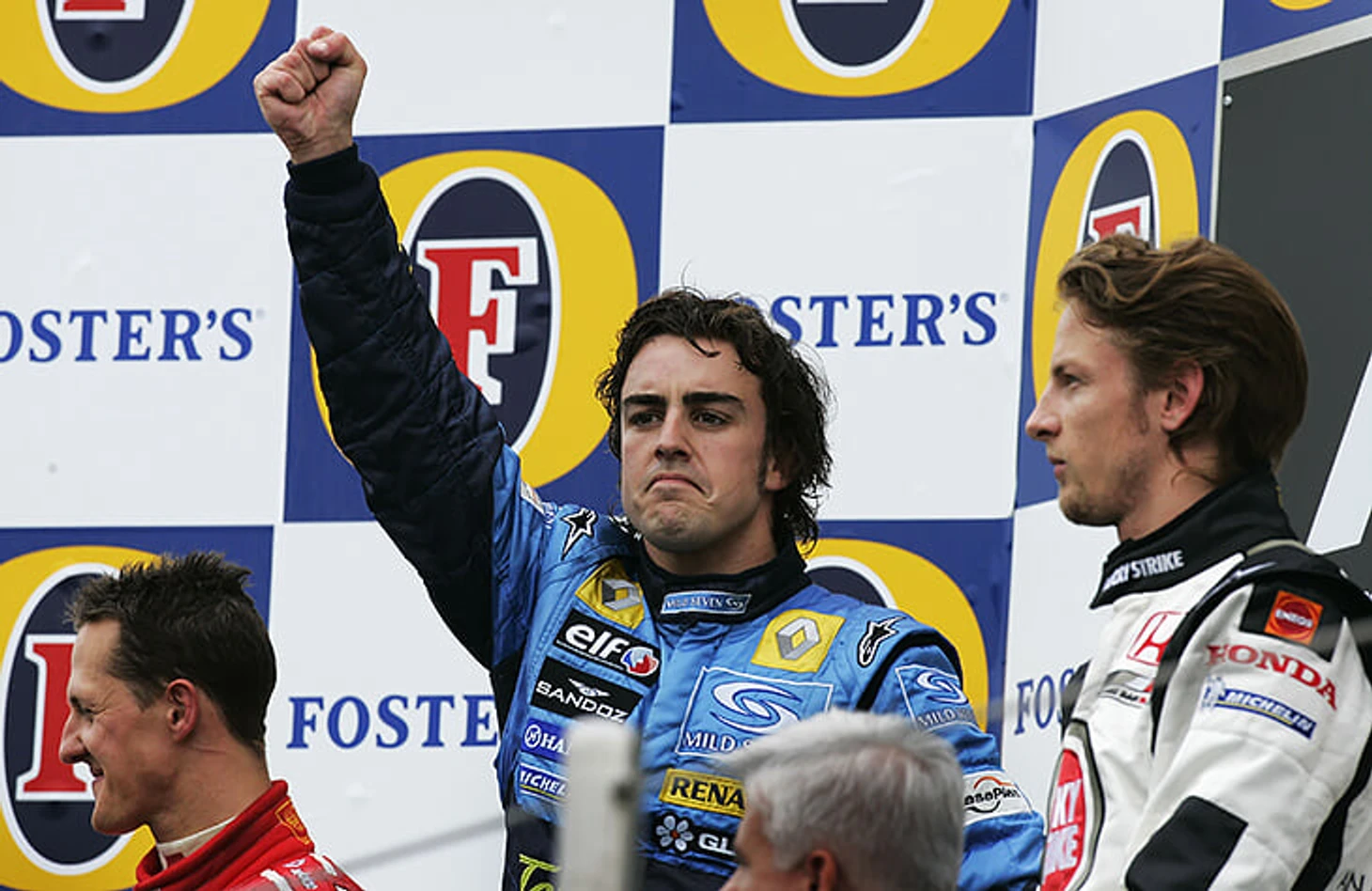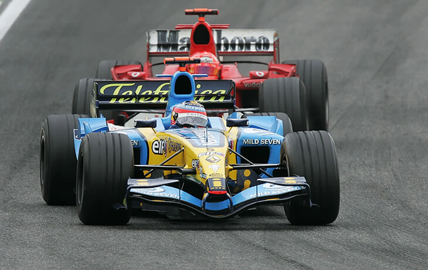 Тогда за рулем «Рено» засияла новая звезда «Ф-1» – Фернандо Алонсо. Тем не менее, испанец не без проблем добыл первый титул в карьере. Некоторые гонки получились особо сложными: например, Гран-при Сан-Марино. В Имоле Алонсо показал выдающиеся навыки обороны против самого Михаэля Шумахера.