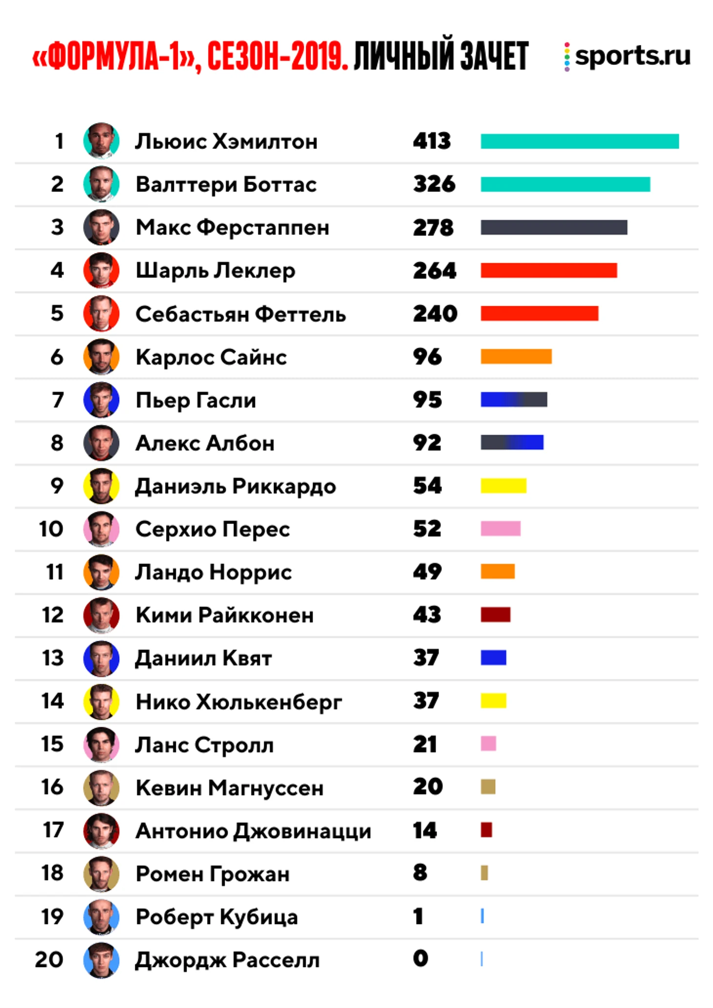 Льюис Хэмилтон выиграл шестой чемпионский титул с рекордным для «Формулы-1» количеством очков в сезоне – англичанин заработал 413 зачетных баллов, на 5 больше, чем в прошлом году.