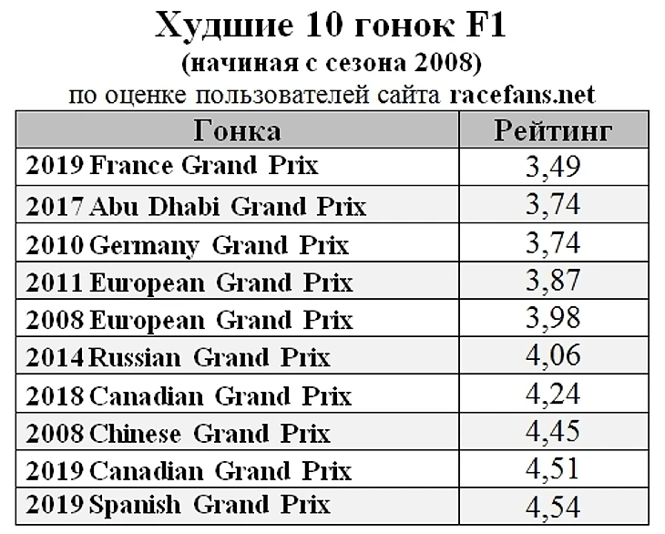 На сайте racefans.net рейтинги составляются на регулярной основе с 2008 года. Это дает возможность составить ТОП 10 для лучших и худших гонок за 12 лет. Причем этот сезон отметился как в одном так и в другом ранжире: