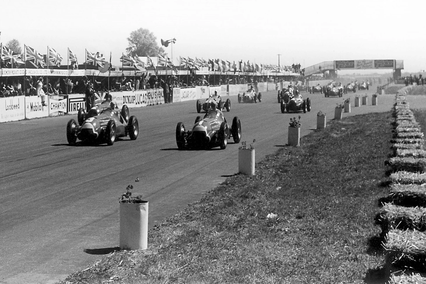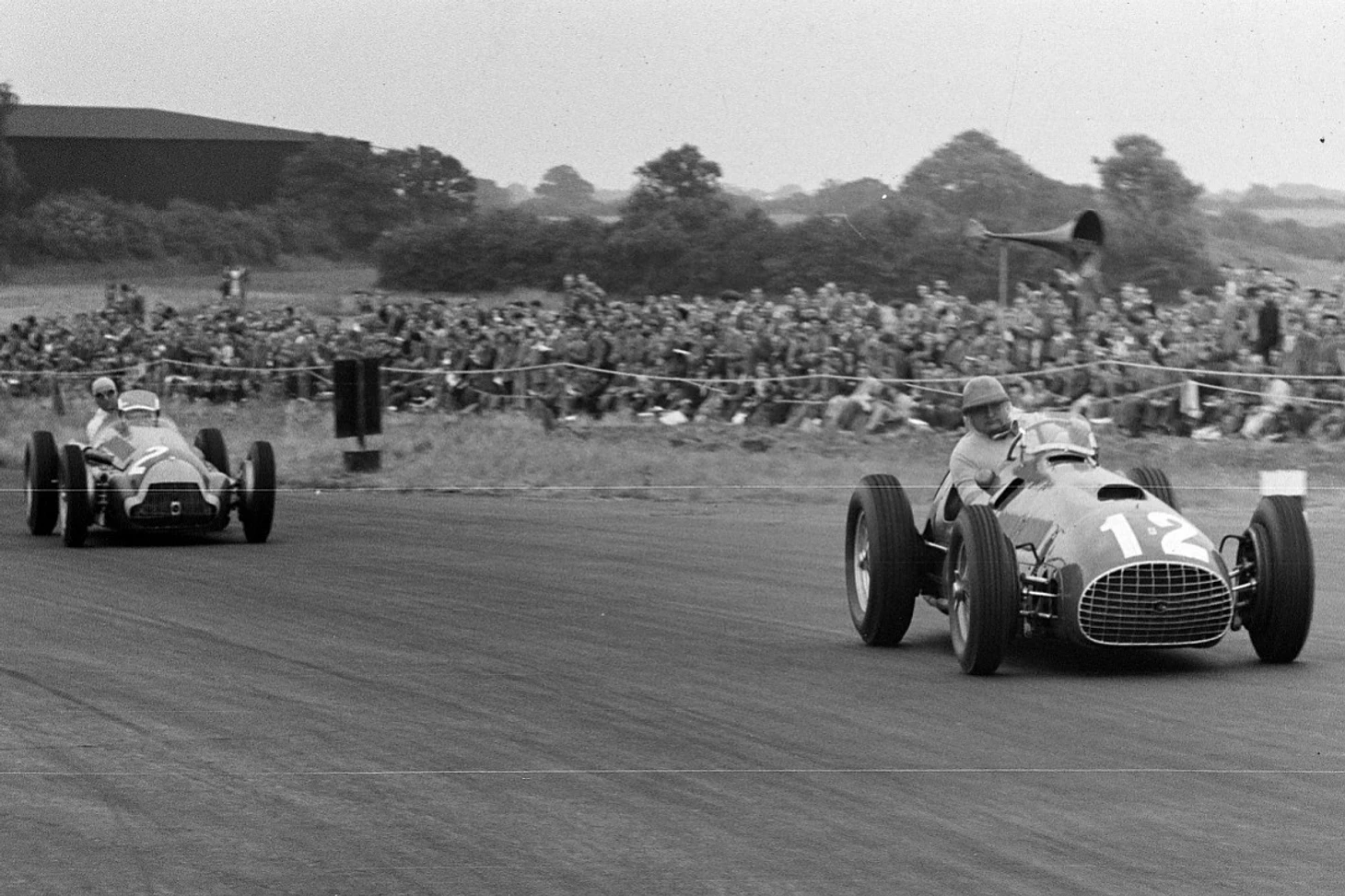 Упорный коренастый Хосе-Фройлан Гонзалес опережает соотечественника Фанхио на пути к первой победе «Феррари» в истории на Гран-при Великобритании 1951 года в Сильверстоуне.