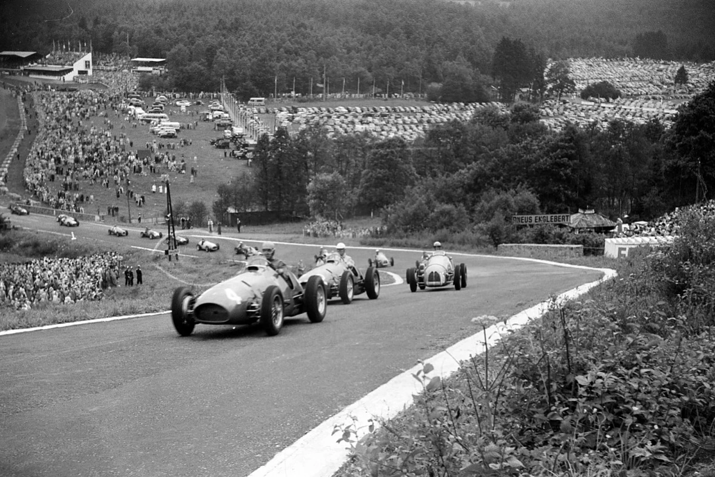 Знакомая панорама для всех, но незнакомый контекст. Альберто Аскари за рулем «Феррари» идет лидером гонки в Бельгии 52-го.