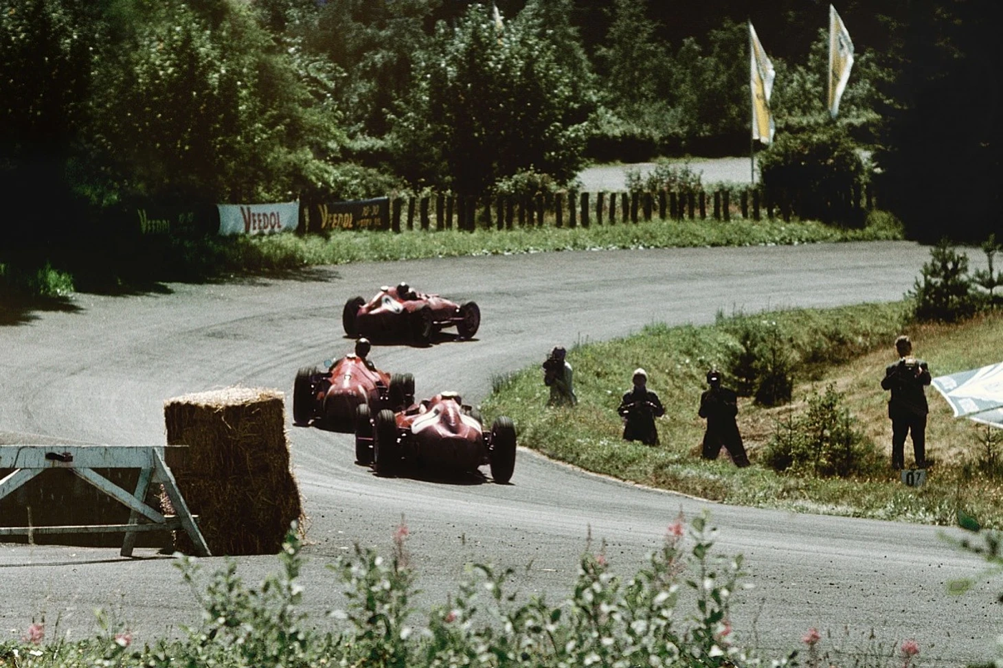 Это был прекрасный день на залитом солнцем Нюрбургринге. Фанхио за рулем Maserati 250F идет позади Майка Хоторна на «Феррари» и впереди второго их пилота Питера Коллинза на Гран-при Германии 1957 года. Позже аргентинец одержит свою самую знаменитую победу.