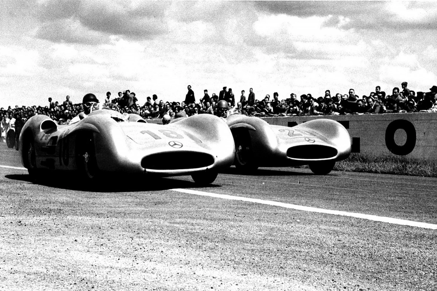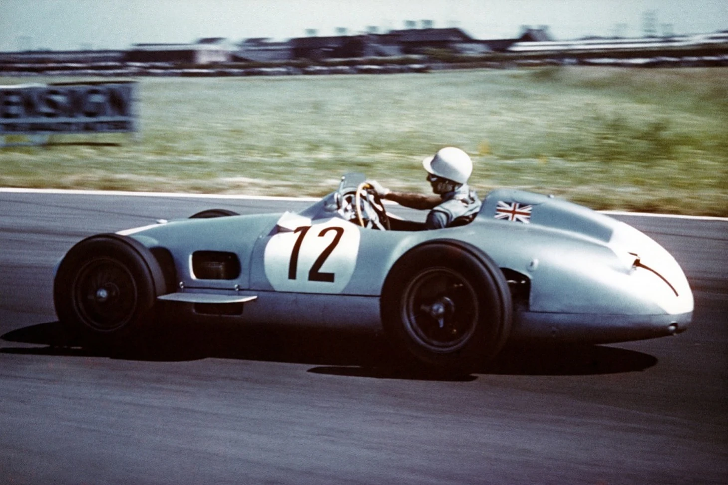 Прекрасные пилотаж сэра Стирлинга Мосса за рулем Mercedes W196 во время Гран-при Великобритании в Эйнтри в 1955 году. Он стал лишь вторым британским пилотом в истории, выигравшим гонку. Первым же был Майк Хоторн на Гран-при Франции в 1953 году.