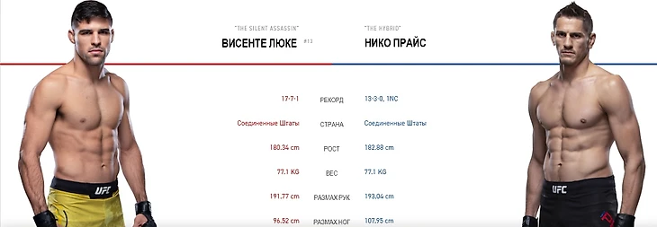 Это один из самых ожидаемых боев этого вечера, т.к. оба бойца могут  завершить этот бой в любой момент. Винсенте  имеет рекорд 10-3 в UFC, 9 из них досрочные. Проиграл свой последний бой Стивену Томсону. Тот бой продемонстрировал дыры в его игре в стойке. С другой стороны клетки Нико Прайс  6-3(1 NK) в UFC - сбалансированный боец, но с большим уклоном в ударку. Все его последние победы и поражения были нокаутами или техническими нокаутами. Ни один из его поединков в UFC не дошёл до решения судей!